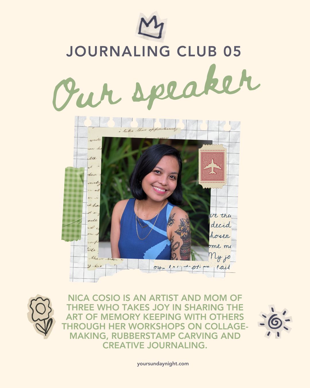 • A junk journaling workshop by Nica Cosio, an artist and mom of three who takes joy in sharing the art of memory keeping with others through her workshops on collage-making, rubberstamp carving and creative journaling.