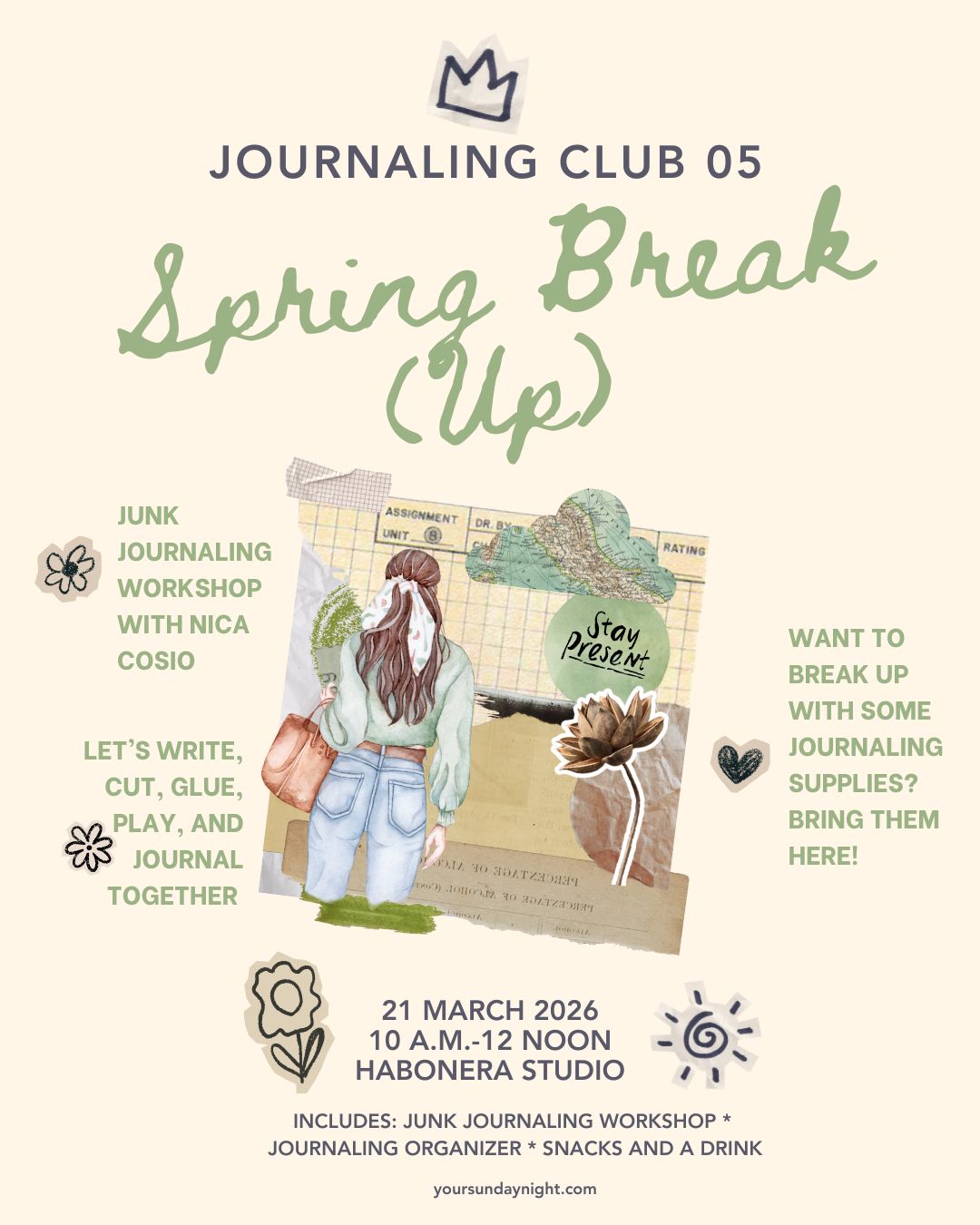 Journaling Club 05: Spring Break (Up) will be held on 21 March 2026, 10 a.m. to 12 noon at Habonera Studio, Magallanes, Makati.